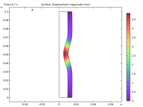 تجزیه و تحلیل در تقارن محوری دو بعدی تنظیم شده است ( شکل 1 ). یک لوله نایلونی به طول 0.1 متر دارای شعاع داخلی 1 سانتی متر و شعاع بیرونی 1.5 سانتی متر است. حاوی سیالی با چگالی ρ = 1·10 3 kg / m 3 و ویسکوزیته μ = 5· 10-3 پس. چگالی نیروی وابسته به زمان و موقعیت به دیواره بیرونی لوله در جهت شعاعی اعمال می شود. این چگالی نیرو را میتوان از دادههای واقعی یک پمپ پریستالتیک گرفته شد. برای سادگی، این مثال آن را با توزیع گاوسی در طول لوله مدل می کند. توزیع گاوسی دارای عرض 1 سانتی متر است و با سرعت ثابت 0.03 متر بر ثانیه در جهت z مثبت حرکت می کند . برای نشان دادن درگیری رول، چگالی نیرو، ضرب در تابع Heaviside صاف شده، در t = 0.1 ثانیه وارد می شود و نیرو را به رشد کامل خود در t = 0.5 می رساند. س به همین ترتیب، جدا شدن رول از t = 1.0 ثانیه شروع می شود و در t = 1.4 s به پایان می رسد. مثال تغییر شکل لوله را در طول یک چرخه کامل 1.5 ثانیه مدل می کند.