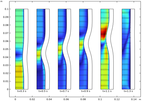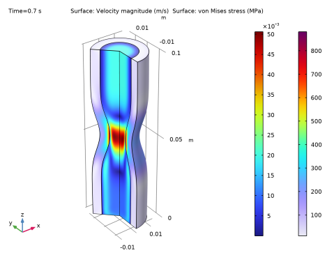 معادلات ناویر-استوکس بر روی یک مش تغییر شکل یافته که آزادانه حرکت می کند، حل می شود که حوزه سیال را تشکیل می دهد. تغییر شکل این مش نسبت به شکل اولیه دامنه با استفاده از هموارسازی Hyperelastic محاسبه می شود. در مرز جامد-سیال در دیواره داخلی لوله، مش متحرک از تغییر شکل ساختاری پیروی می کند. برای اطلاعات بیشتر، لطفاً به بخش تعامل سیال-سازه در راهنمای کاربر ماژول مکانیک سازه مراجعه کنید .