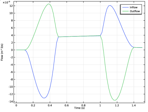 شکل 4: جریان ورودی و خروجی بر حسب m3 / s به عنوان تابعی از زمان. مقادیر مثبت نشان می دهد که سیال از طریق ورودی به داخل و از طریق خروجی خارج می شود.