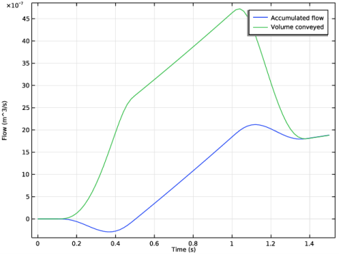 شکل 4 جریان ورودی و خروجی را نشان می دهد و رفتار کلی نشان داده شده در عکس های فوری سرعت را تایید می کند. توجه داشته باشید که یک پمپ پریستالتیک واقعی معمولا پیک های مرتبط با تغییرات حجم را با کمک رول دوم که همزمان با جدا شدن رول اول درگیر می شود حذف یا به حداقل می رساند. به این ترتیب، به سختی تغییرات حجمی ایجاد می شود و سیال همیشه به سمت جلو جریان می یابد. همچنین از شکل 4 توجه داشته باشید که با گرفتن اختلاف منحنی ها
