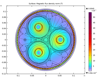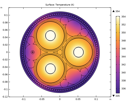 که ρ 0 به مقاومت مرجع در T ref اشاره دارد و α ضریب دمای مقاومت در 1/ K است. با گنجاندن مقاومت خطی شده، تلفات و دماها یک بار دیگر تجزیه و تحلیل می شوند. در مرحله سوم، رسانایی در صفحه نمایش و زره نیز به دما وابسته است (اگر در مدل سازی اثرات القایی تازه کار هستید، نتیجه ممکن است غیرقابل درک باشد). میانگین دمای حاصل در فازها، صفحهها و زرهها ارزیابی میشود، بنابراین میتوان از آنها در آموزش جلوههای القایی 3 بعدی استفاده کرد .