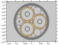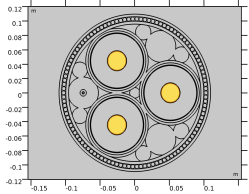 شکل 1: سطح مقطع کابل شامل سه فاز (زرد)، صفحه نمایش (قرمز)، XLPE (سفید)، زره (آبی) و فیبر (سبز).