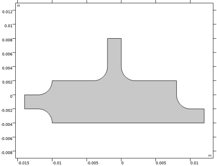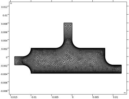 در اینجا u بردار سرعت (واحد SI: m/s)، v in، بالا سرعت ورودی در ورودی بالا و u in سرعت کنترل شده با PID است. در خروجی، فشار را روی 0 تنظیم کنید . شرایط مرزی بدون لغزش همه دیوارها را توصیف میکند به جز بخشهای ورودی که شرایط لغزش در آن اعمال میشود، که امکان انتقال صاف به پروفیل سرعت آرام را فراهم میکند.