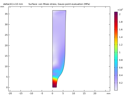 شکل 3 توزیع تنش فون میزس را در نمونه نشان می دهد. شکل همچنین تغییر شکل نمونه را نشان میدهد و اینکه چگونه رفتار غیرخطی ماده باعث گردنبندی سطح مقطع مرکزی آن میشود. همانطور که در شکل 4 مشاهده می شود، گردن شدن به دلیل کرنش های پلاستیکی بسیار بزرگ در صفحه تقارن عمودی ایجاد می شود. ازدیاد طول 10 میلی متر منجر به کرنش پلاستیکی معادل بزرگتر از 2.5 (یعنی 250٪) در ناحیه آسیب دیده می شود. در چنین کرنش های پلاستیکی بزرگ، نمونه احتمالا قبلاً پاره شده است.