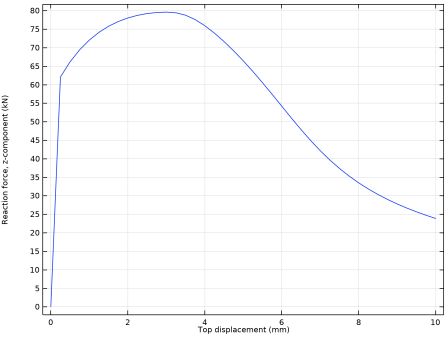 شکل 6 نیروی واکنش را به عنوان تابعی از جابجایی محوری نشان می دهد. اوج بار در 3 میلیمتر ثبت میشود و پس از آن بار شروع به کاهش میکند، همانطور که نمونه در بالا بحث شد. در یک جابجایی محوری در حدود 7 میلی متر، منحنی شروع به صاف شدن می کند، این اثر مدل پلاستیسیته غیرمحلی است. با این حال، در این مرحله، نمونه در واقعیت پاره میشد، اما برای ثبت چنین رفتاری، مدل مادی باید گسترش یابد.