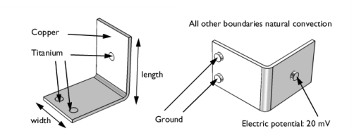 تمام سطوح، به جز سطوح تماس با پیچ، توسط همرفت طبیعی در هوای اطراف شینه خنک می شوند. می توان فرض کرد که مرزهای مقطع پیچ به خنک کردن یا گرمایش دستگاه کمک نمی کند. پتانسیل الکتریکی در سطح پیچ عمودی بالا سمت راست 20 میلی ولت است و این پتانسیل در دو سطح افقی پیچ های پایینی 0 ولت است.