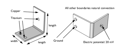 تمام سطوح، به جز سطوح تماس با پیچ، توسط همرفت طبیعی در هوای اطراف شینه خنک می شوند. می توان فرض کرد که مرزهای مقطع پیچ به خنک کردن یا گرمایش دستگاه کمک نمی کند. پتانسیل الکتریکی در سطح پیچ عمودی بالا سمت راست 20 میلی ولت است و این پتانسیل در دو سطح افقی پیچ های پایینی 0 ولت است.
