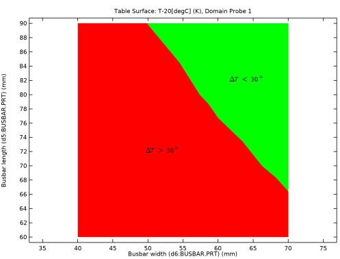 شکل 5: میانگین افزایش دما بالاتر از دمای محیط در باسبار در برابر پارامترهای عرض و طول رسم شده و برای نشان دادن ترکیبات پارامترهایی که منجر به افزایش دما بیش از 30 درجه می شود، فرمت شده است.