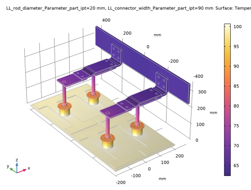 هنگام طراحی کوپلینگ به شینه، هدف قرار دادن دمای عملیاتی پایین برای اجزای مسی برای جلوگیری از اکسیداسیون بیش از حد و حفظ رسانایی الکتریکی بالا مهم است. هدف از شبیه سازی شما محاسبه دقیق میزان گرم شدن شینه و مطالعه تاثیر دو پارامتر طراحی، قطر میله های بلند شده از بالای آند و عرض کانکتورهای مسی است که به بین سلولی متصل می شوند. باسبار، روی پدیده با انجام یک جارو پارامتریک می توانید تعیین کنید که کدام ترکیب از این پارامترها منجر به حداکثر دما در اجزای مسی کمتر از 90 درجه سانتیگراد می شود. بالاتر از این دما، سرعت اکسیداسیون مس شروع به افزایش می کند.