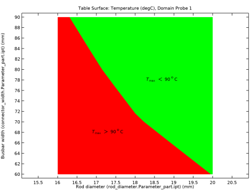 شکل 4: حداکثر دما در مجموعه باسبار در برابر پارامترهای قطر میله و عرض رابط رسم شده و برای نشان دادن ترکیبات پارامترهایی که منجر به حداکثر دمای کمتر از 90 درجه سانتیگراد می شود، فرمت شده است.
