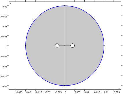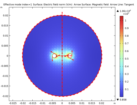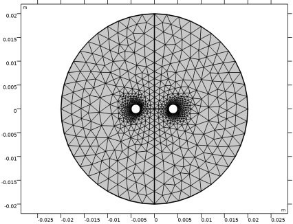 از آنجا که یک خط انتقال سیم موازی در حالت TEM کار می کند ؟ با میدان های الکتریکی و مغناطیسی نرمال در جهت انتشار در طول کابل ? مدل سازی یک مقطع دو بعدی برای محاسبه میدان ها و امپدانس کافی است. برای این مثال، هادی های کامل و یک منطقه هوای بدون تلفات را در نظر بگیرید. سیمها با شعاع 1 میلیمتر، با فاصله 8 میلیمتری از مرکز به مرکز جدا میشوند.