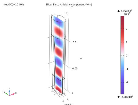 شکل 2: جزء x از موج منتشر شده در داخل آداپتور موجبر در فرکانس 10 گیگاهرتز.