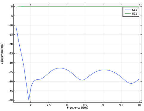 شکل 3: پارامتر S 11 و پارامتر S 21 (در دسی بل) به عنوان تابعی از فرکانس. این پارامتر به ترتیب انعکاس‌ها را هنگامی که آداپتور موجبر در پورت مستطیلی برانگیخته می‌شود و اندازه‌ای از بخشی از موج را توصیف می‌کند که از طریق پورت بیضوی هنگامی که آداپتور موجبر در پورت مستطیلی برانگیخته می‌شود، منتقل می‌شود.