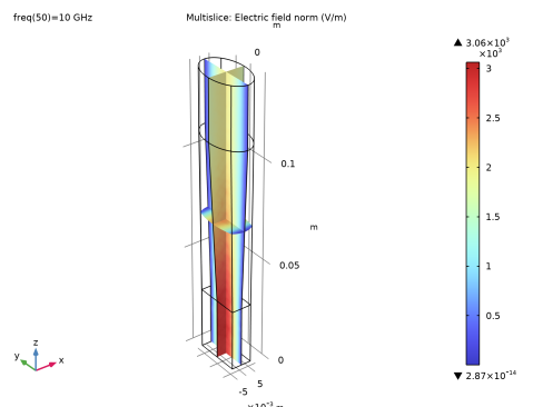 نمودار اکنون مؤلفه x میدان الکتریکی را در بالاترین فرکانس، 10 گیگاهرتز نشان می دهد (مقایسه با شکل 2 ). اگر می‌خواهید فیلد فرکانس‌های دیگر را ببینید، می‌توانید با کلیک بر روی گروه نمودار میدان الکتریکی (emw) آنها را انتخاب کنید .