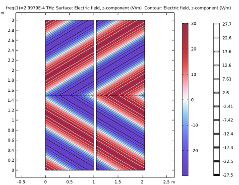 نمودار پیش فرض هنجار میدان الکتریکی را نشان می دهد. نمودار را برای نشان دادن مولفه z میدان الکتریکی تغییر دهید، سپس یک نمودار کانتور اضافه کنید.