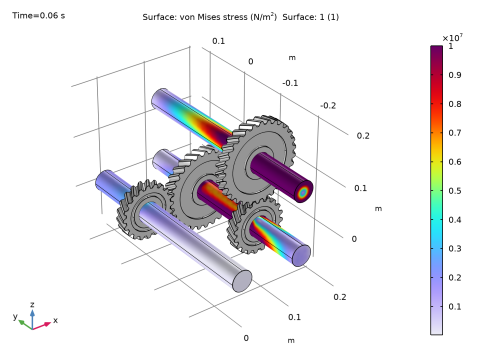 شکل 6 توزیع تنش فون میزس را در شفت ها نشان می دهد. مشاهده می شود که حالت تنش در شفت ها ترکیبی از پیچش و خمش شفت ها است. اثر پیچش در محور محرک که در آن گشتاور بارگذاری اعمال می شود، غالب است. بخشهای باقیمانده از شفتها عمدتاً بار خمشی ایجاد شده در اثر عمل چرخدنده را تجربه میکنند.