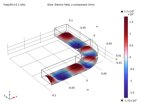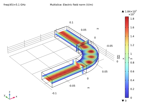 نمودار پیش فرض توزیع هنجار میدان الکتریکی را بر روی برش های موجبر برای بالاترین فرکانس در جارو نشان می دهد. به الگوی موج در خم و قسمت ورودی مستطیلی توجه کنید. این نشان دهنده امواج ایستاده ناشی از انعکاس در خم است. در مقابل، الگوی فراتر از خم مستقل از مختصات y است و نشان می دهد که پورت خروجی کار خوبی در انتقال موج انجام می دهد.