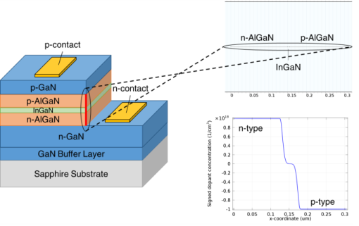 این مدل یک دیود ساطع نور مبتنی بر GaN (LED) را شبیه سازی می کند. این نشان می دهد که چگونه می توان از رابط نیمه هادی برای ارزیابی انتشار نوری از دستگاه های الکترونیک نوری با رانش الکتریکی با استفاده از ویژگی انتقال نوری استفاده کرد. همچنین مثالی از چگونگی حل مشکلات ناشی از جریان با ایجاد شرایط اولیه مناسب از مطالعات مبتنی بر ولتاژ ارائه می دهد. طیف انتشار، شدت و بازده کوانتومی به عنوان تابعی از جریان محرک به منظور ارزیابی شرایط عملیاتی بهینه محاسبه میشوند. توجه داشته باشید که اثرات محصور شدن کوانتومی در ناحیه فعال نازک در مدل گنجانده نشده است.