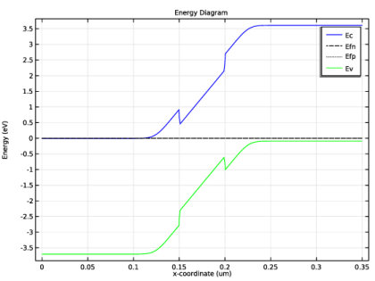 شکل 2: نمودار سطح انرژی برای حالت بایاس صفر. نوار هدایت (semi.Ec) و باند ظرفیت (semi.Ev) یک مانع بالقوه بین نواحی دوپ شده n دست چپ و نواحی دوپ شده دست راست را نشان می دهد. لایه InGaN یک چاه پتانسیل در هر دو باند ایجاد می کند.