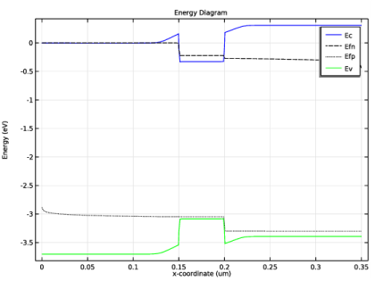 نمودار سطح انرژی برای دستگاه در دو بایاس ولتاژ مختلف در شکل 2 و شکل 3 نشان داده شده است . نوار رسانایی و ظرفیت به ترتیب semi.Ec و semi.Ev و ترازهای شبه فرمی الکترون و سوراخ با semi.Efn و semi.Efp برچسبگذاری میشوند.، به ترتیب. در هر دو مورد، دوپینگ PIN آشکار است، زیرا باعث ایجاد یک مانع بالقوه بین ناحیه n دوپ شده دست چپ و ناحیه دوپ شده p دست راست می شود. لایه InGaN شکاف باند پایین باعث ایجاد یک چاه پتانسیل در هر دو باند هدایت و ظرفیت می شود. برای شبیه سازی کاملاً دقیق، اثرات محصور کوانتومی این چاه با ضخامت 50 نانومتر باید در نظر گرفته شود. این اثرات در این مدل گنجانده نشده است. نتیجه اصلی این است که طیف انتشار محاسبهشده شامل کمکهای حالتهای اکسایتون محدود یا انتقال بین سطوح انرژی محدود کوانتومی در دو چاه پتانسیل نمیشود. در حالت سوگیری صفر ( شکل 2) سطوح شبه فرمی از لبه های نوار در لایه InGaN فاصله دارند. زمانی که دستگاه در حالت تعادل است و هیچ نوری ساطع نمی شود، انتظار می رود. هنگامی که ولتاژ 3.3 ولت به سمت p دستگاه اعمال می شود ( شکل 3 ) بایاس رو به جلو ارتفاع مانع پتانسیل بین مناطق نوع n و نوع p را همانطور که انتظار می رود کاهش داده است. سطح انرژی شبه فرمی الکترون اکنون بالای لبه نوار رسانایی در لایه InGaN است، بنابراین انتظار داریم نوار رسانایی با الکترون در این ناحیه پر شود. سطح انرژی حفره شبه فرمی بسیار نزدیک به لبه باند ظرفیت است، بنابراین انتظار داریم نوار ظرفیت پر از سوراخ باشد.