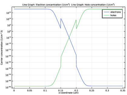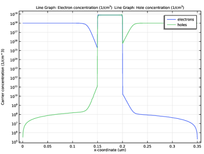 چندین راه مختلف برای غلبه بر چالش عددی ارسال شده توسط غیرخطی بودن در سیستم معادلات وجود دارد. در اینجا از مرحله مطالعه تعادل نیمه هادی برای بدست آوردن محلول تعادل به عنوان شرط اولیه برای مطالعه زیر استفاده می کنیم . برای سایر روشهای جایگزین برای دستیابی به همگرایی، به مثال مدل تأیید heterojunction_1d مراجعه کنید.