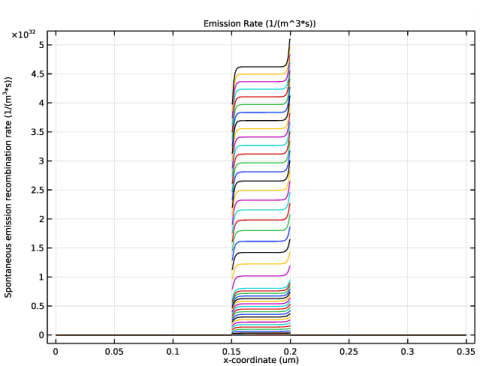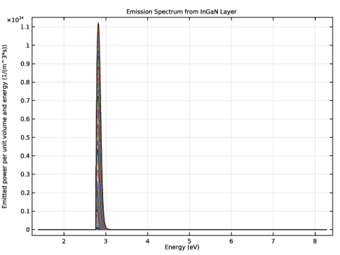 طیف انتشار را می توان با استفاده از عبارت comp1.atxd1 (0.1525e-6, semi.ot1.dP_dE) رسم کرد . متغیر semi.ot1.dP_dE توان ساطع شده در واحد حجم و انرژی است. دستور comp1.atxd1(coord,var) متغیر var را دریافت میکند که در یک بعد اضافی متصل به جزء 1، از مختصات در هندسه مدل محاسبه میشود.