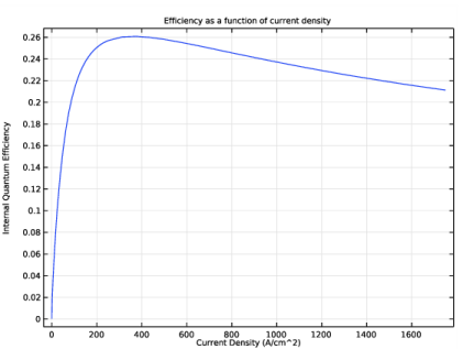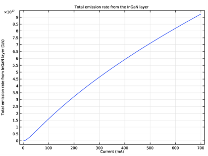 در این مدل، ناحیه ساطع نور فعال یک LED آبی مبتنی بر GaN مدل سازی شده است. خواص انتشار به عنوان تابعی از جریان محرک بررسی می شود و بازده محاسبه می شود.