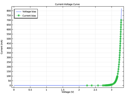 مطالعه بایاس جریان با بایاس اعمالی 1 uA آغاز می شود، از جدول می بینیم که این مقدار جریان زمانی جریان می یابد که ولتاژ V_p = 2.2 V اعمال شود. بنابراین ما راه حل مربوطه را برای شرایط اولیه در مطالعه بایاس جریان انتخاب می کنیم و میدان ورودی ولتاژ اولیه شرایط مرزی تماس فلزی جریان محور را روی همان مقدار تنظیم می کنیم. توجه داشته باشید که محدوده جریان های اعمال شده برای تعیین ویژگی های غیرخطی در نمودار جریان در مقابل ولتاژ و نمودار بعدی از بازده انتخاب شده است.