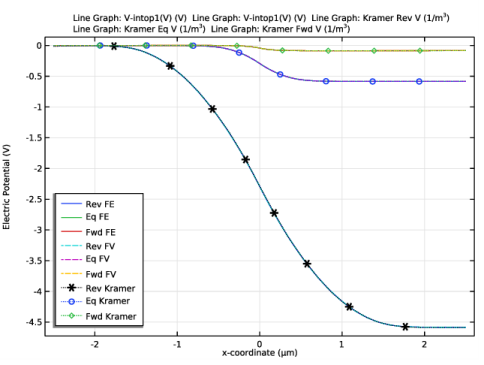 شکل 1: پتانسیل الکتریکی با استفاده از روش های المان محدود (FE) و حجم محدود (FV) تحت بایاس های مختلف، یعنی بایاس معکوس (Rev)، تعادل (Eq) و جلو (Fwd) به دست آمده است. نتایج با نتایج محاسبه شده در Ref. 1 (کرامر)