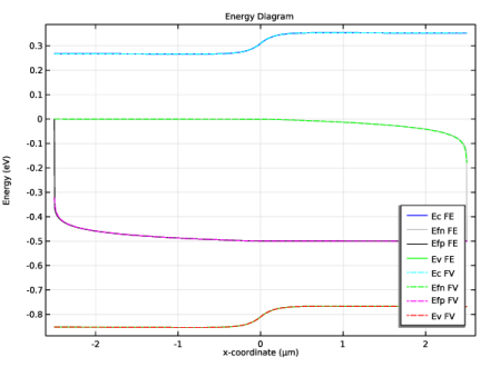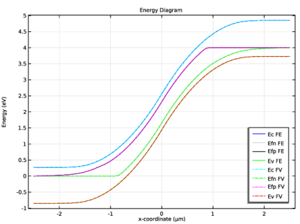 شکل 6: نمودار انرژی به دست آمده با استفاده از روش المان محدود (FE) و حجم محدود (FV) تحت بایاس رو به جلو (0.5 V).
