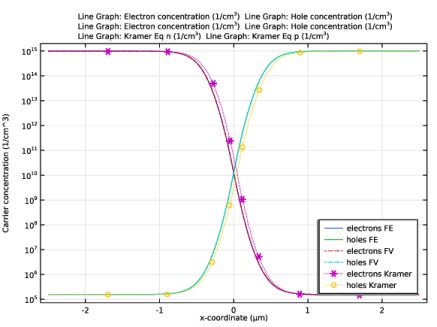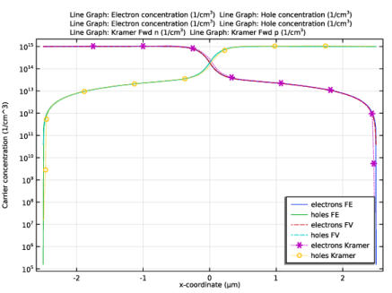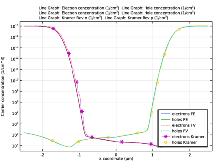 شکل 3: غلظت الکترون و حفره به دست آمده با استفاده از روش المان محدود (FE) و حجم محدود (FV) تحت بایاس معکوس (4-V). پروفیل ها با موارد محاسبه شده در Ref مقایسه می شوند. 1 (کرامر).