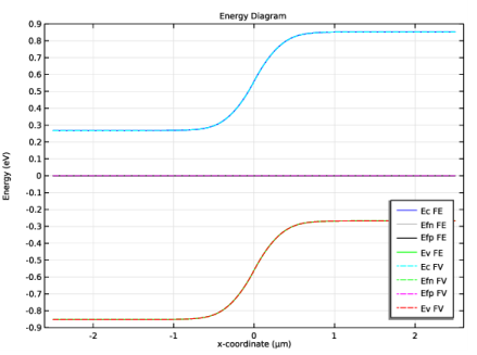 شکل 1 پتانسیل الکتریکی در محل اتصال را برای شرایط مختلف بایاس نشان می دهد. توافق خوبی بین عنصر محدود، حجم محدود و مرجع برای همه شرایط بایاس نشان داده شده است. شکل 2 ، شکل 4 و شکل 6 نمودارهای انرژی را برای هر شرایط بایاس نشان می دهد. این ارقام یک تطابق کامل بین المان محدود (با استفاده از تثبیت جریان- انتشار) و محاسبات حجم محدود را نشان میدهند. مقایسه غلظت حامل ها نیز تطابق بسیار خوبی را بین محاسبات مرجع، عنصر محدود و حجم محدود نشان می دهد – به شکل 3 ، شکل 5 و شکل 7 مراجعه کنید .