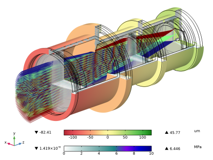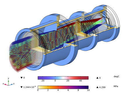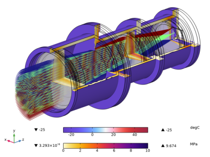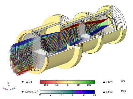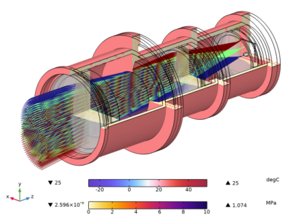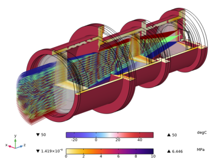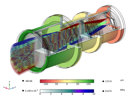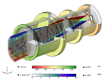 شکل 2 تا شکل 5 دما (که یکنواخت است) را همراه با تنش فون میزس در طول مقطع نشان می دهد. تنش ها در حداکثر دامنه دما، جایی که نتایج اختلاف زیاد در ضرایب انبساط حرارتی (CTE) عناصر در گروه عدسی دوم آشکار می شود، بیشترین است.