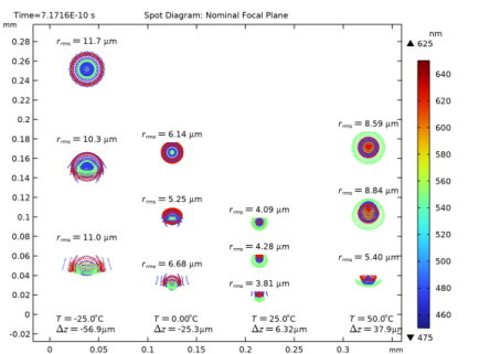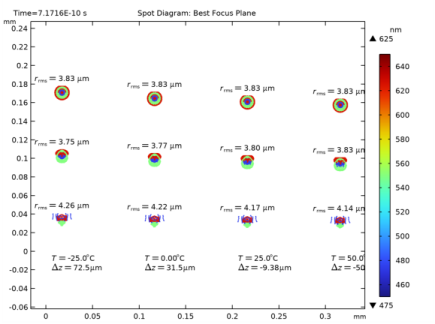 یک جارو پارامتریک در طیف وسیعی از دماها انجام می شود. T 0 = – 25 درجه سانتی گراد، 0 درجه سانتی گراد، +25 درجه سانتی گراد و +50 درجه سانتی گراد. ردیابی پرتو با استفاده از سه طول موج ( 475  نانومتر، 550  نانومتر و 625  نانومتر) در سه زاویه میدان ( 0 درجه، 3.5 درجه و 7.0 درجه) انجام میشود. پس از اطمینان از اینکه مجموعه داده Ray 1 از یک راه حل از جابجایی پارامتریک استفاده می کند، می توان از مقادیر پارامتر در هر یک از نمودارهای دما و جابجایی برای مشاهده نتایج عبور کرد.