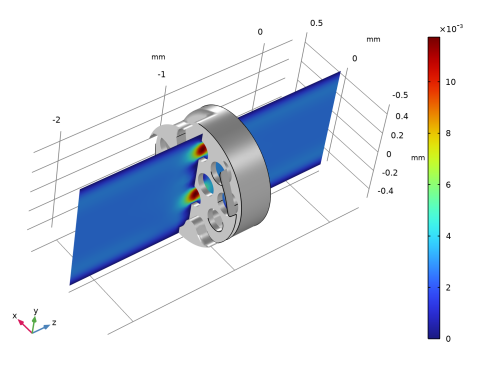 فشار آکوستیک (با استفاده از مقیاس رنگی نامتقارن) در 10 کیلوهرتز در شکل 4 نشان داده شده است . سرعت لحظه ای و تغییرات دما در 1 کیلوهرتز به ترتیب در شکل 5 و شکل 6 نشان داده شده است . در مدل، پارامتر فرکانس را می توان به منظور تجسم گسترش لایه های مرزی چسبناک و حرارتی تغییر داد. پورت تحریک کننده سیستم را نیز می توان تغییر داد (اعم از ورودی یا خروجی).