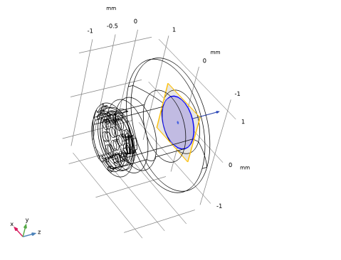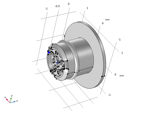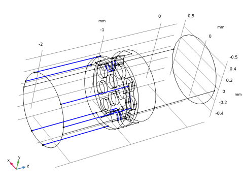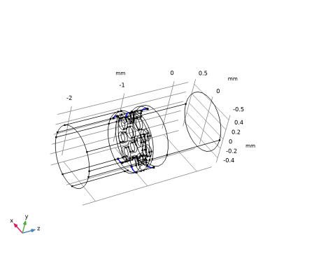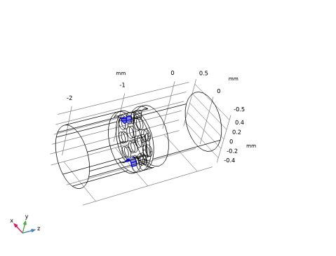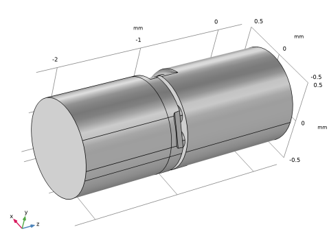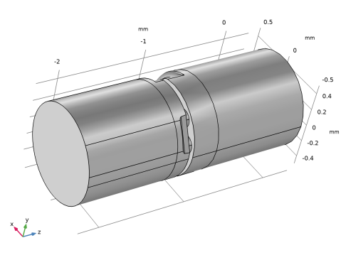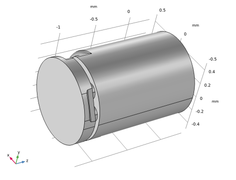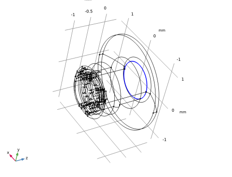 در این آموزش خواص آکوستیک محافظ موم مورد تجزیه و تحلیل قرار می گیرد. از آنجایی که ابعاد سیستم کوچک است (زیر میلیمتر)، مهم است که تلفات مربوط به لایههای مرزی آکوستیک حرارتی و چسبناک را به تصویر بکشیم. این مدل در حوزه فرکانس با رابط فیزیک Thermoviscous Acoustics، Frequency Domain حل شده است . ماتریس انتقال سیستم با استفاده از شرط مرزی پورت محاسبه می شود . از آنجایی که پورت ها انتشار موج صفحه را فرض می کنند، باید به دور از هرگونه تغییر هندسه ناگهانی (مانند صفحه سوراخ شده در محافظ مومی) قرار گیرند. برای انجام این کار، یک لوله ورودی به طول 1 میلی متر به هندسه اضافه می شود. حوزه شبیه سازی حجم هوای داخل محافظ موم شامل لوله ورودی است، همانطور که در شکل 3 نشان داده شده است..